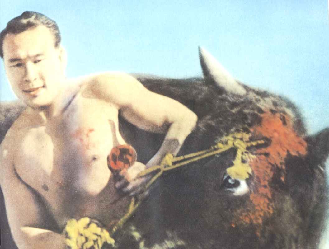 The mural shows Ōyama in the process of ripping the horns off a bull.