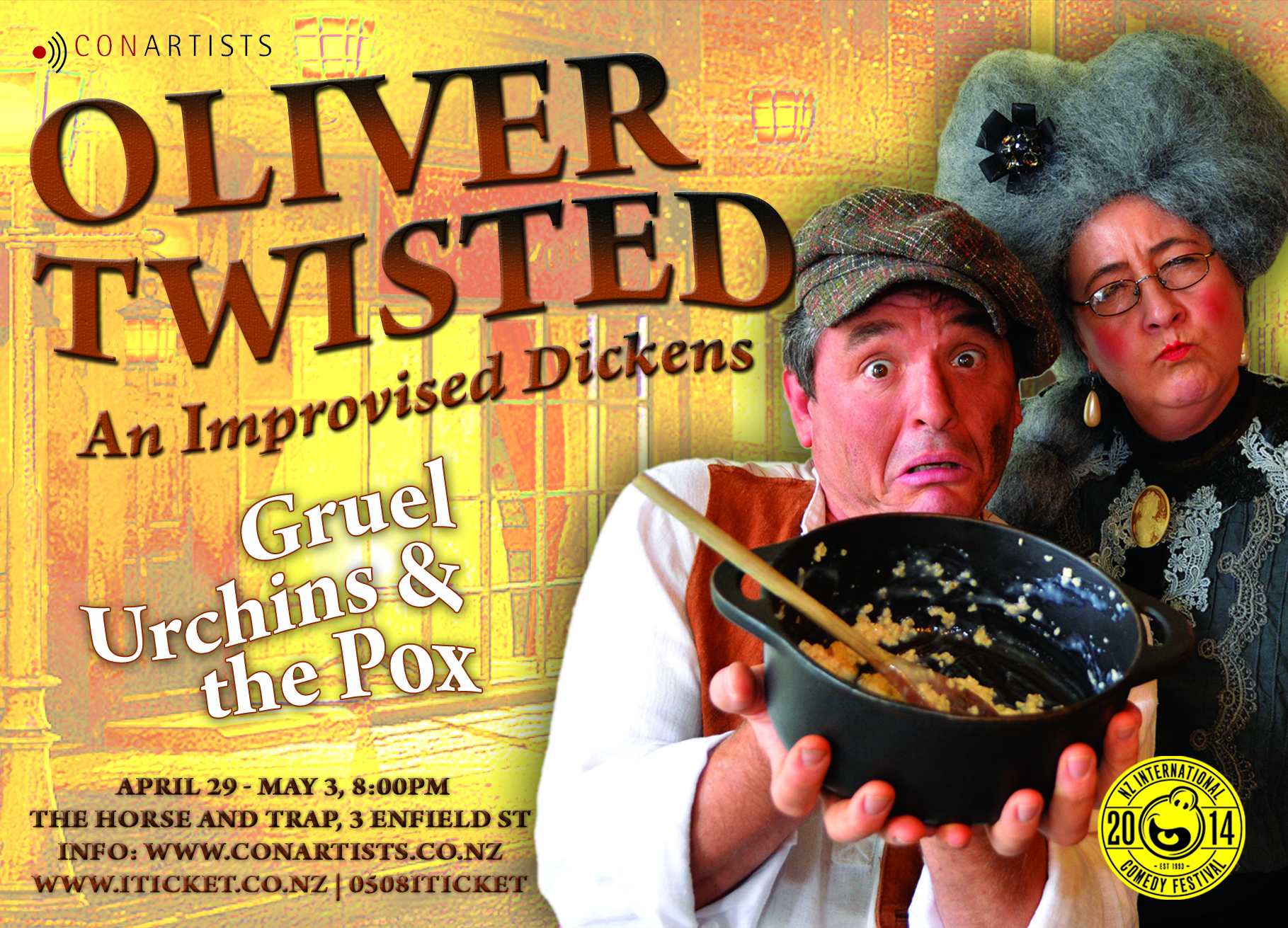He might well have been talking about Conartists production of ‘Oliver Twisted’, a long form improvisation which owes a lot to Mr Dickens and not overly much to his great serialised novel ‘Oliver Twist’ or, as it was aptly subtitled, ‘The Parish Boy’s Progress’. The journey changes every performance because the audience sets the parameters but nevertheless what was created reeked of Dickens’ London, the workhouse and a Victorian England filled with faux humbuggery, podsnappery and bumbledom.