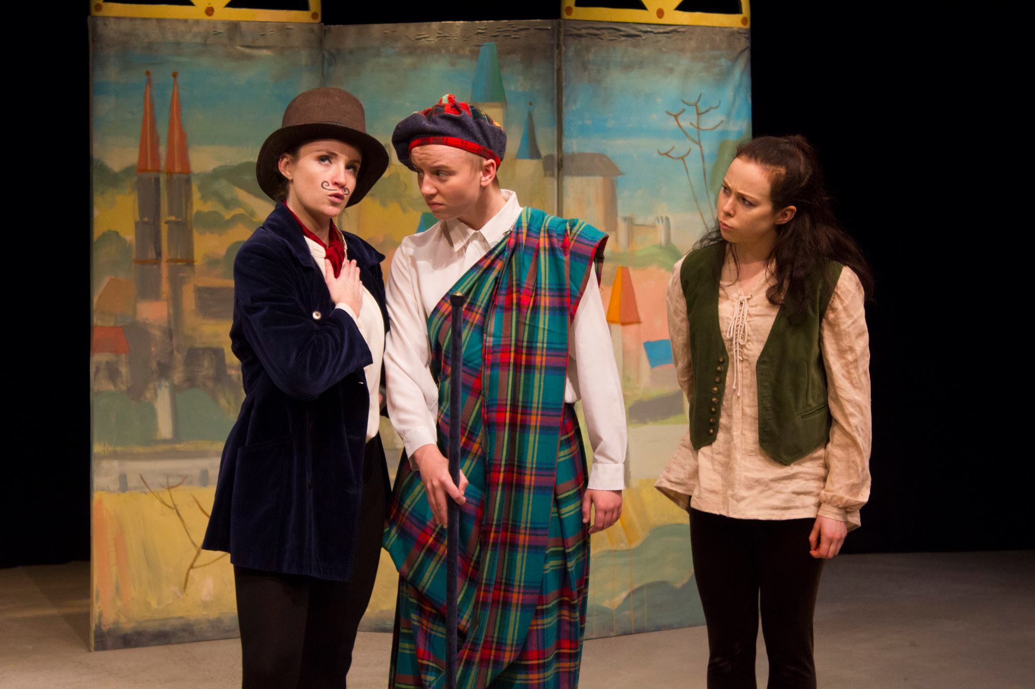 The set is simple, two screens separated by a rope-handled trunk, one screen with a rural scene from Padua in pastels, the other a more unban view. The costumes are a wonderful mash-up of commedia styles mostly in browns and creams and with footwear ranging from soft-soled dance pumps to Katherina’s heavy-weight bovver boots. It’s incredibly attractive and evocative of sun and the unpredictable fervours of hormonal youth.