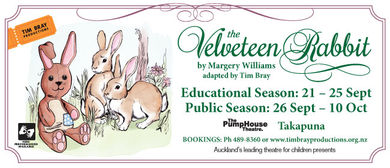 In recent times Tim Bray Productions has focused primarily on writing by established and popular New Zealand authors of the quality of Joy Cowley, Margaret Mahy, Lynley Dodd and Witi Ihimaera but here he changes generation and ethnicity, zips back in time to 1922 and across the seas to the U S of A and picks up ‘The Velveteen Rabbit’, a children’s classic almost one hundred years old. Published in 1922 this would have been the book du jour for the families of servicemen returned a mere four years earlier from the horror of the trenches or perhaps of solo mothers whose men had not returned at all, and read, pre-television and electronic media, to wide-eyed youngsters whose destiny was, a mere seventeen years later, to do the world war thing all over again. The book’s existential themes of how do we ‘make things real’ and what is ‘reality’ must have been incredibly accessible to its new audience in the 1920’s and 30’s and, unsurprisingly, remains so today.